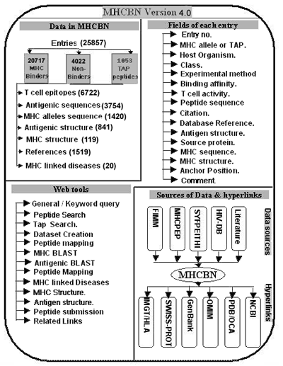 The MHCBN web server was developed in a UNIX environment on SUN server 420E in Solaris 7.0. This server is designed to provide easy access to the user, based upon a set of simple GUI (Graphical User Interface) forms. Methods for searching the databases and displaying the selected objects were built with a combination of Java Scripts, CGI-scripts in PERL